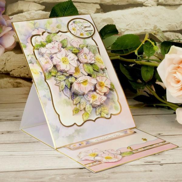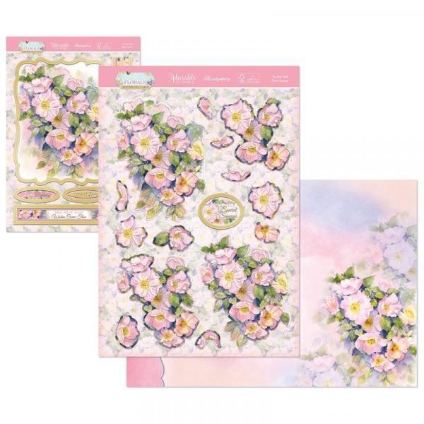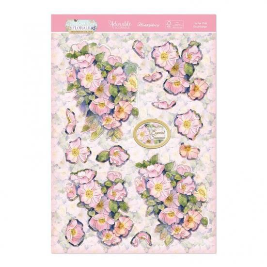 Das Kartenset "In the Pink" von Hunkydory UK bietet das Zubehör zur Herstellung einer dekorativen Karte mit mehrlagiger Decoupage-Technik im Design "Flourishing Florals". Die Packung enthält