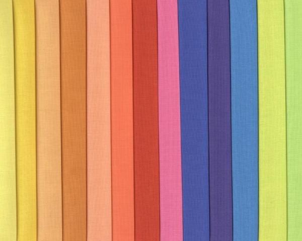 Das Paket enthält 13 Zuschnitte Fat Quarter, jeweils ca. 50cm x 55cm aus der Kollektion "Kona Cotton" von Robert Kaufman, USA. Alle Stoffe sind Patchworkstoffe aus 100% Baumwolle.