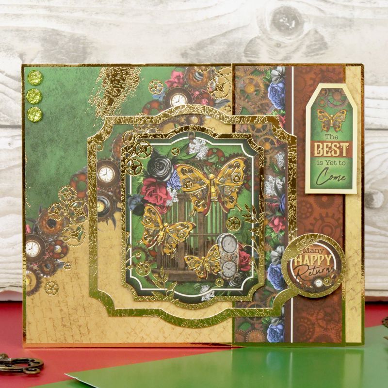 Die Luxury Topper Collection "Clockwork Emporium" von Hunkydory UK bietet das Zubehör zur Herstellung von mindestens 16 hochdekorativen Karten in Designs der Kollektion "Clockwork Emporium". Die Packung enthält