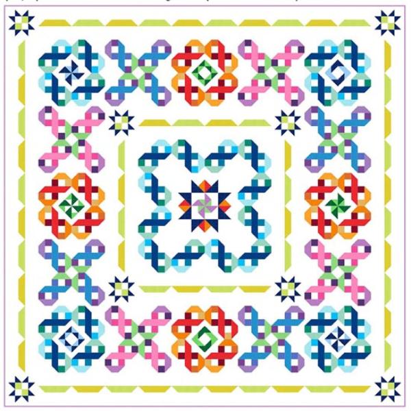 Diese Materialpackung enthält alle erforderlichen Stoffe und die Anleitung zum Nähen von Top und Binding des Quilts "Ribbon Rainbow" in der Größe Queen Size nach einem Entwurf von Marilyn Foreman, Quilt Moments, USA.