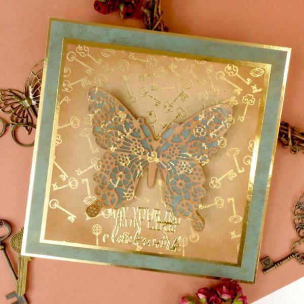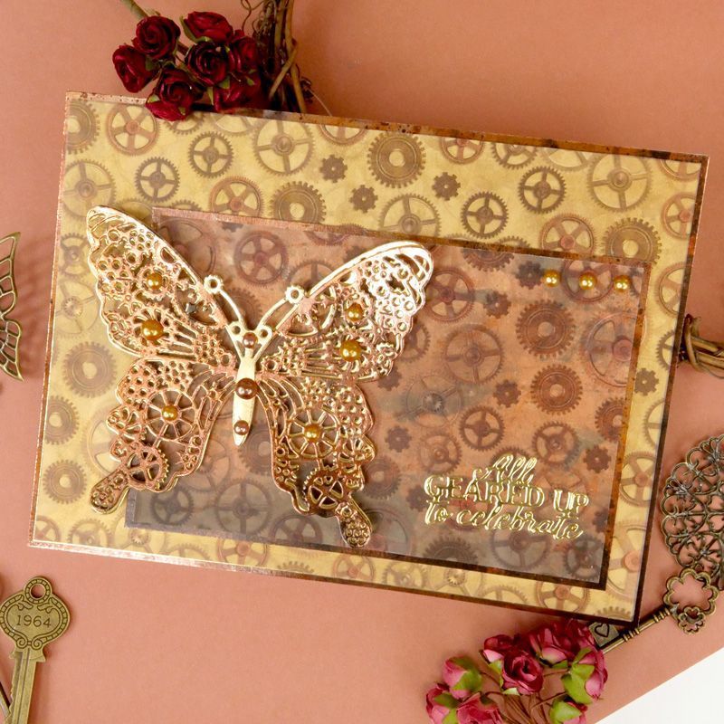 Die Stanzform "Metal Wings" aus der Kollektion "Clockwork Emporium" der Marke "Moonstone Cutting Dies" von Hunkydory erzeugt einen zauberhaften Schmetterling als Eyecatcher im viktorianischen Steampunk-Stil. Verzieren Sie Karten und Scrapbookseiten mit dem tollen Schmetterling. Alleine eingesetzt ebenso wie zusammen mit weiteren Artikeln der Kollektion "Clockwork Emporium" gibt diese Stanzformen einen tollen Auftritt und lässt sich abwechslungsreich kombinieren. Ganz besonders spektakulär wirken die Steampunk-Designs aus Mirri-Karton ausgeschnitten, siehe unsere Beispielkarten!!