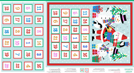 Patchworkstoff mit Adventskalender-Panel aus 100% Baumwolle, Hersteller Makower UK. Der Stoff liegt ca. 1,10 Meter breit.