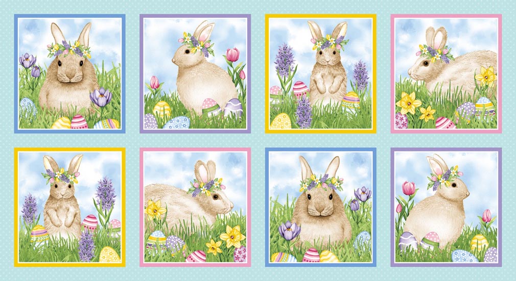 Patchworkstoff Hoppy Hunting 01 Panel aus der Kollektion "Hoppy Hunting", Quiltstoff aus 100% Baumwolle, Hersteller Henry Glass Fabrics, USA. Der Stoff liegt ca. 1,10 Meter breit.