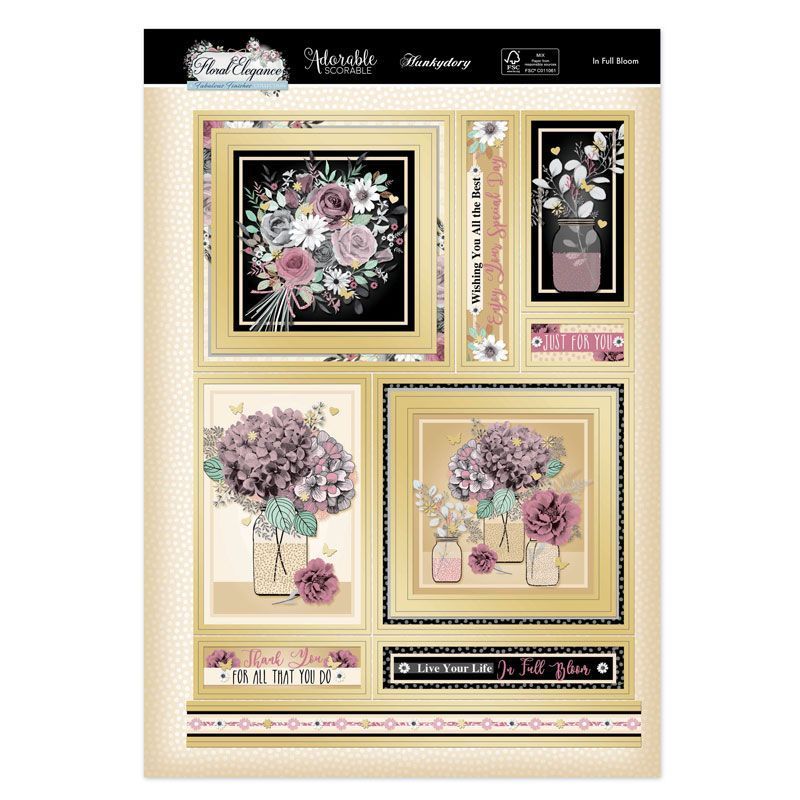 Das Kartenset "In Full Bloom" von Hunkydory UK bietet das Zubehör zur Herstellung von mindestens 2 dekorativen Karten im Design "Floral Elegance". Die Packung enthält