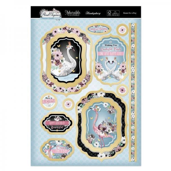 Das Kartenset "Queen for a Day" von Hunkydory UK bietet das Zubehör zur Herstellung von mindestens 2 dekorativen Karten im Design "Floral Elegance". Die Packung enthält