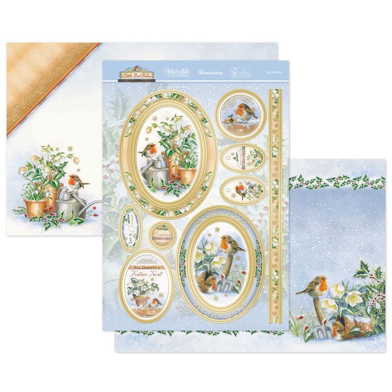 Das Topper-Set "Let it Snow" von Hunkydory UK bietet das Zubehör zur Herstellung von mindestens 2 dekorativen Karten im Stil der Kollektion "Little Red Robin". Die Packung enthält