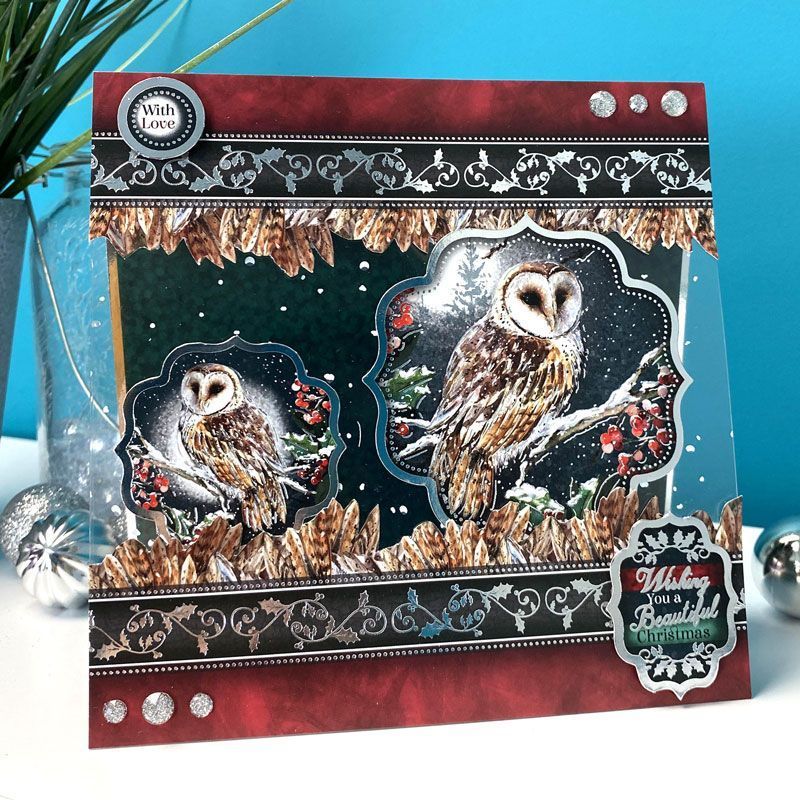 Das Kartenset "Midnight Owl" von Hunkydory UK bietet das Zubehör zur Herstellung von mindestens 2 dekorativen Karten im Design "Winter Wonderlands". Die Packung enthält